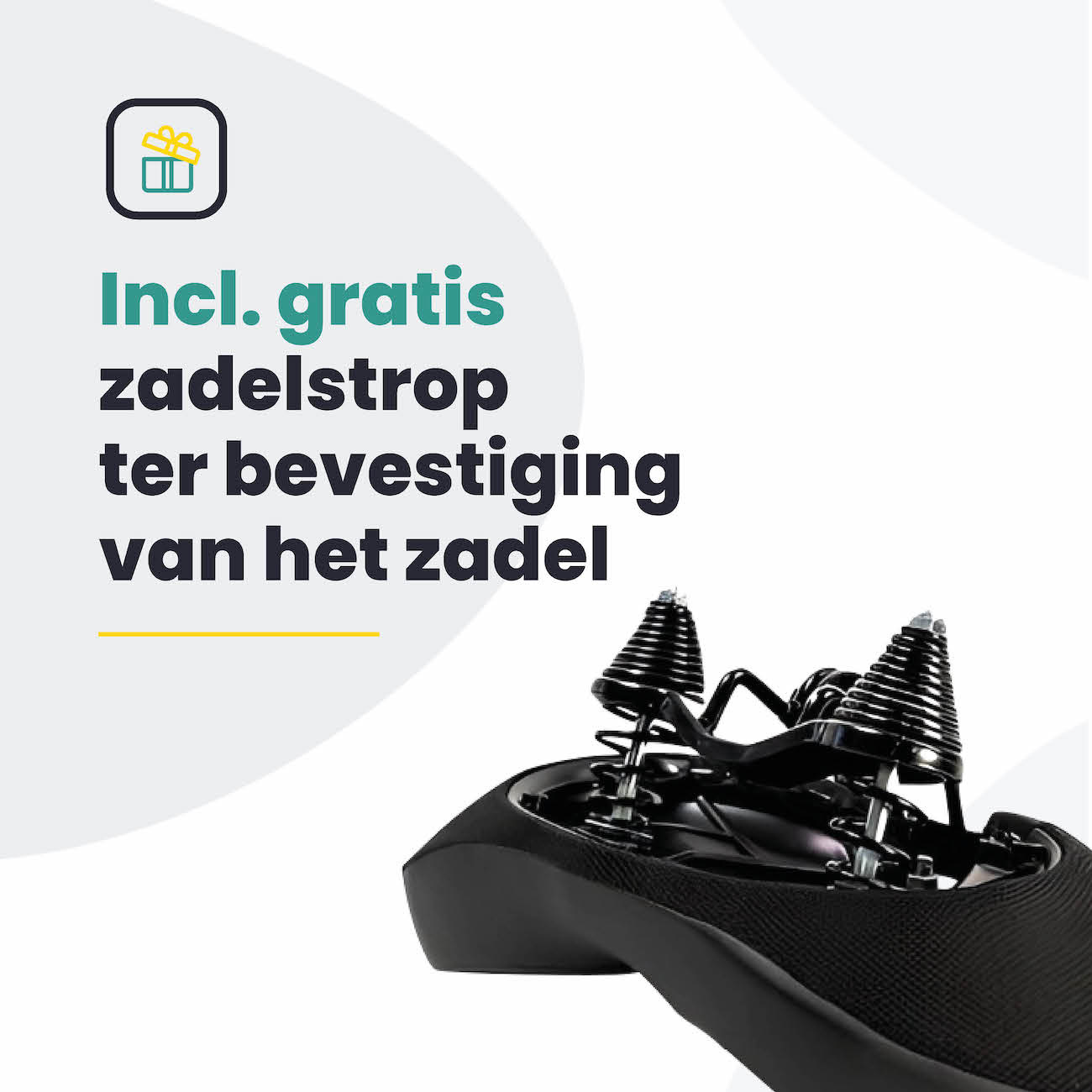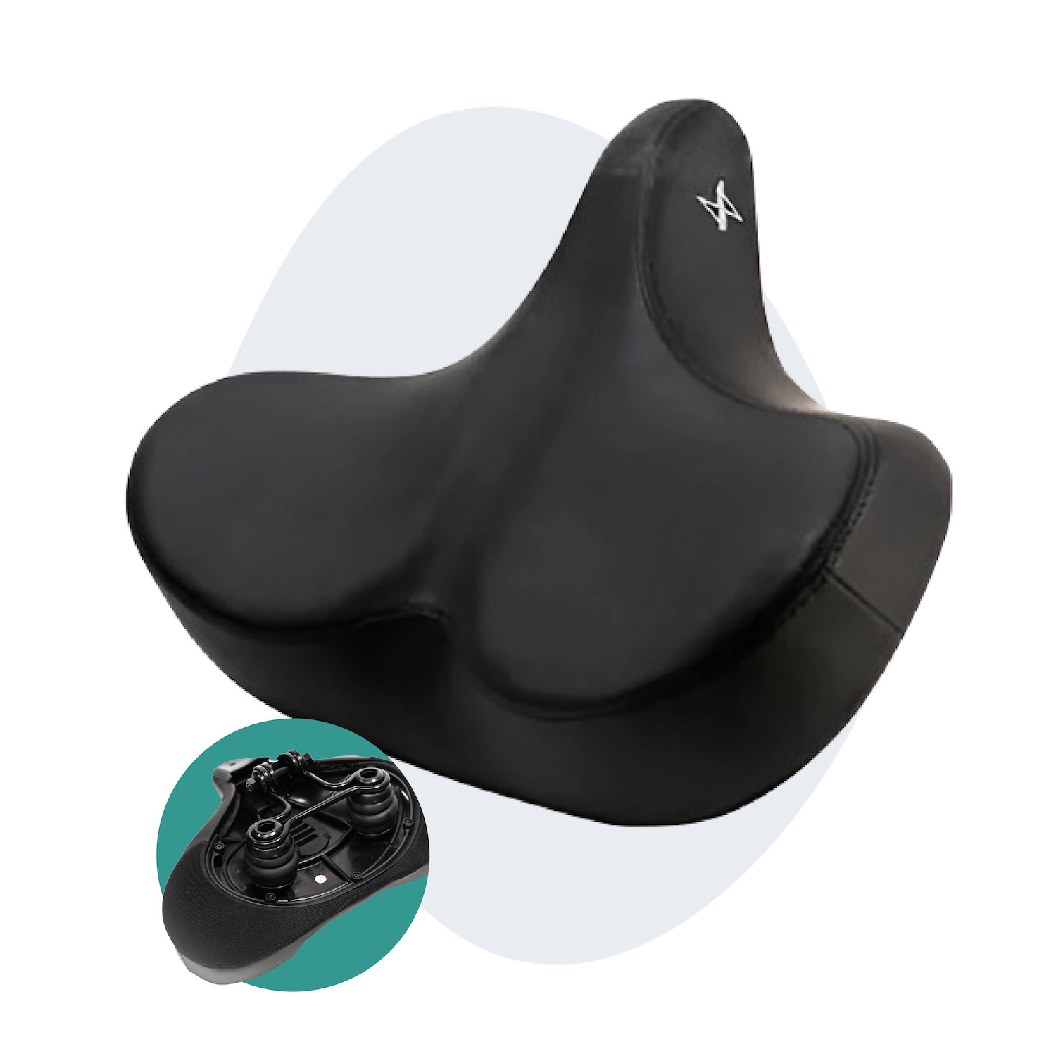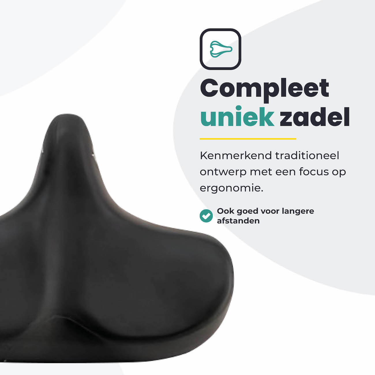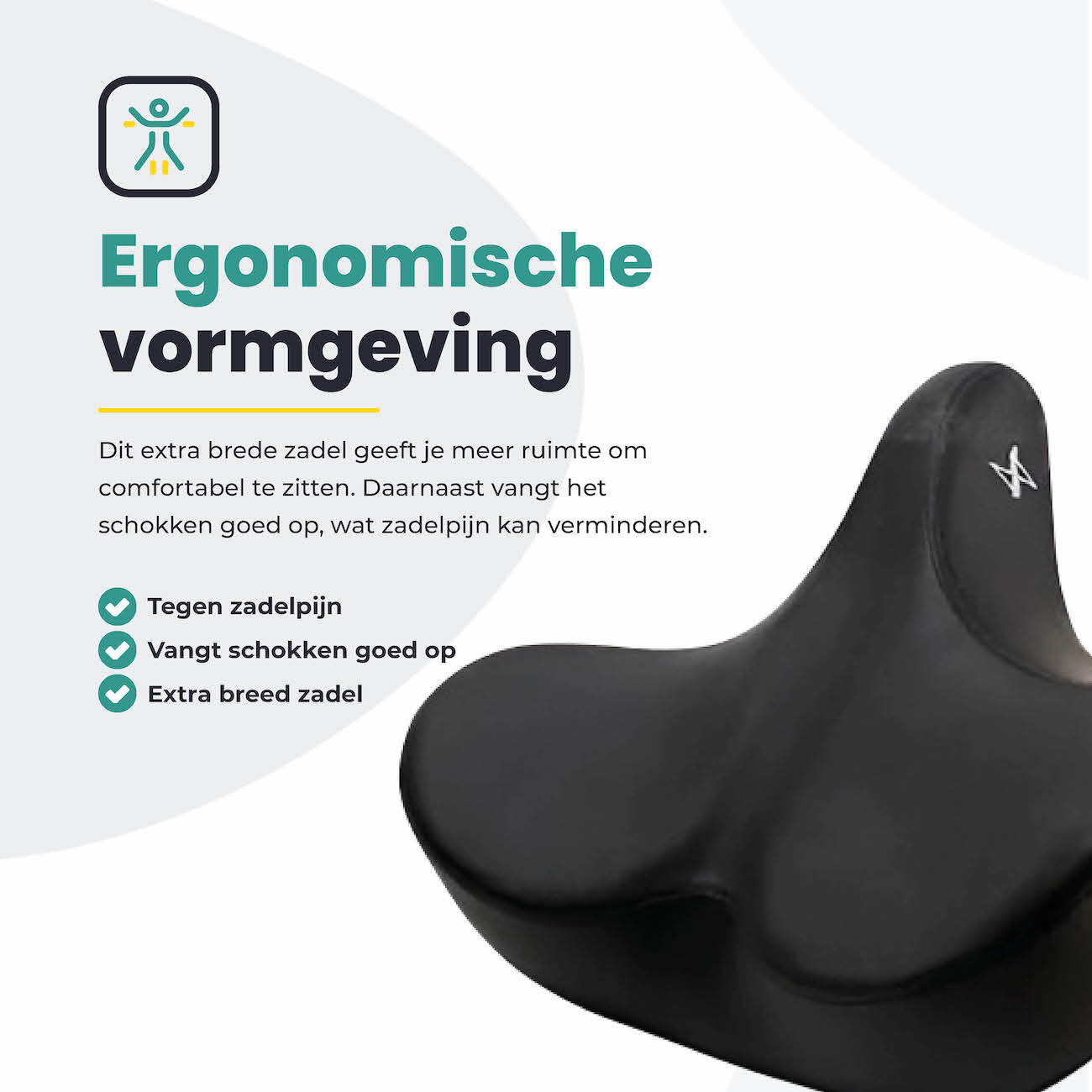 Het extra brede fietszadel is aan beide kanten voorzien van een gevleugeld design. Dit gevleugelde design omsluit de billen perfect, hierdoor wordt de druk over een groter oppervlak verdeeld wat resulteert in minder zadelpijn. Ook zorgt het gevleugelde design dat je niet gaat schuiven op de fiets. Zo ontstaat er ook geen geïrriteerde huid door schuiven op het zadel.