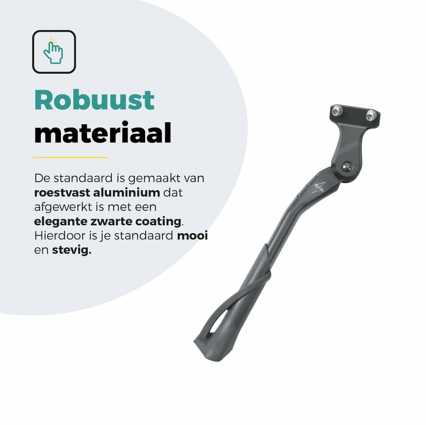 De Voltano Enkele Fietsstandaard Verstelbaar – 24” t/m 28” – 40 MM Montage is gemaakt van hoogwaardig roestvast aluminium en afgewerkt met een stijlvolle zwarte coating. Deze standaard is niet alleen functioneel maar ook qua uiterlijk is het een stijlvol standaard. Dankzij de sterke brede poot blijft je fiets stabiel rechtop staan, zelfs op oneffen terrein. De stevige constructie zorgt voor langdurige betrouwbaarheid. De standaard is eenvoudig te monteren, met de twee meegeleverde boutjes bevestig je de standaard moeiteloos op het achtervork van je fiets. De Voltano standaard is verstelbaar en daardoor geschikt voor fietsen met wielmaten van 24”, 26” en 28”. Of je nu een stadsfiets, hybride of trekkingfiets hebt, deze standaard biedt uitkomst. De standaard is compact van formaat.