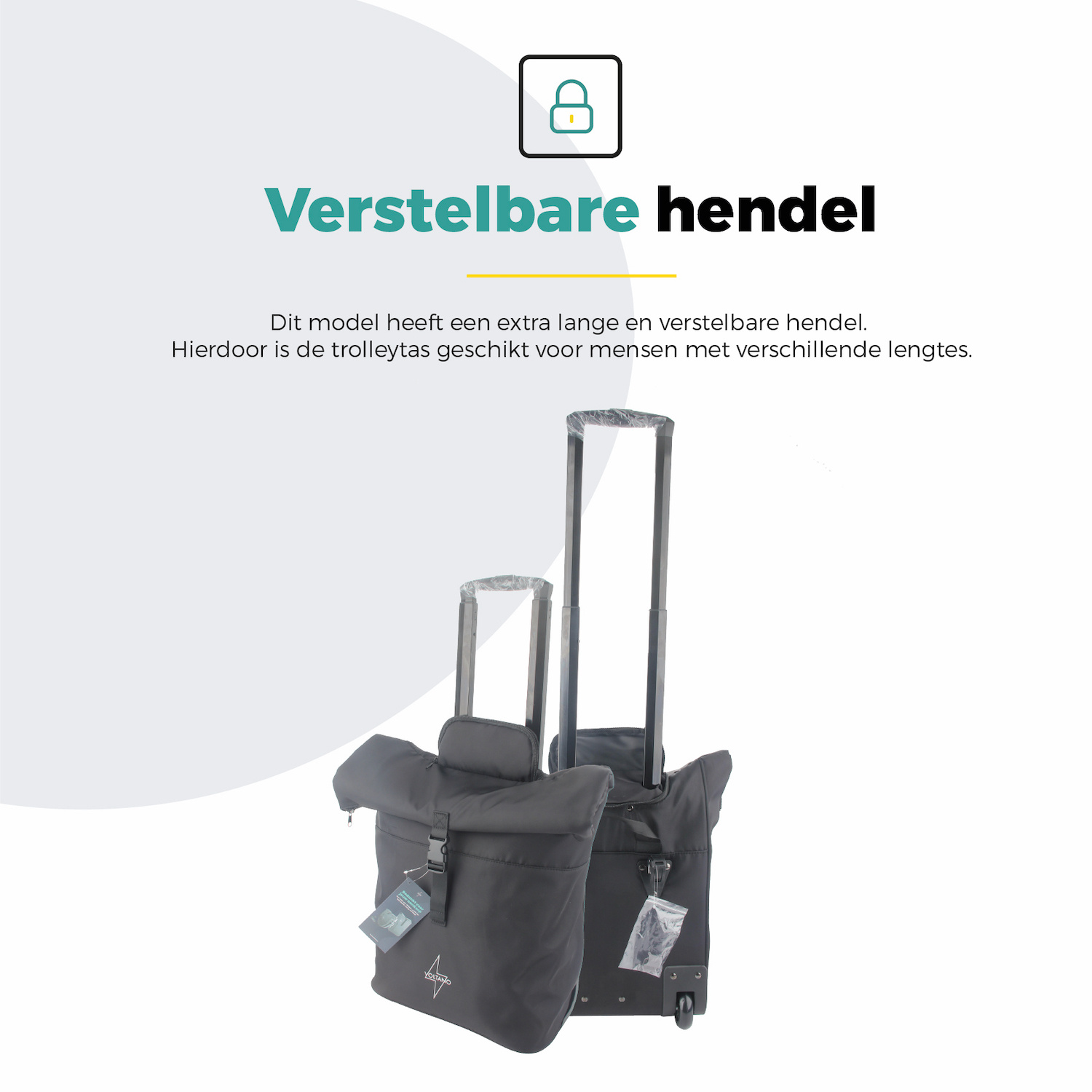 De Voltano Fietstrolley tas is niet alleen functioneel, maar ook comfortabel en duurzaam. Met een ergonomisch gevormde handgreep trek je de trolley moeiteloos voort, zelfs tijdens langre reizen. De kunststof wielen zijn soepel en stevig, waardoor je altijd geniet van een stabiele en prettige rit. De speciale beugel aan de onderkant zorgt ervoor dat de tas stevig op zijn wielen staat wanneer je de tas even niet nodig hebt.