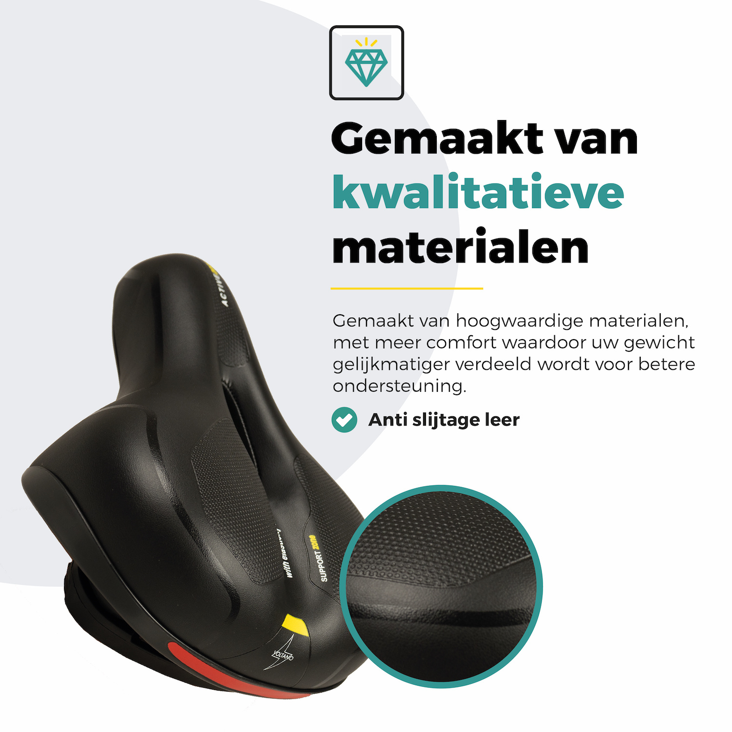 Dit zadel is voorzien van een uitsparing in het midden van het zadel. Deze is precies zo vormgegeven dat, samen met de gebruikte materialen, het uw zitbotjes en andere pijnlijke delen ontlast. De druk wordt weggehaald waardoor u ook bij langere fietstochten geen last meer van zadelpijn heeft.