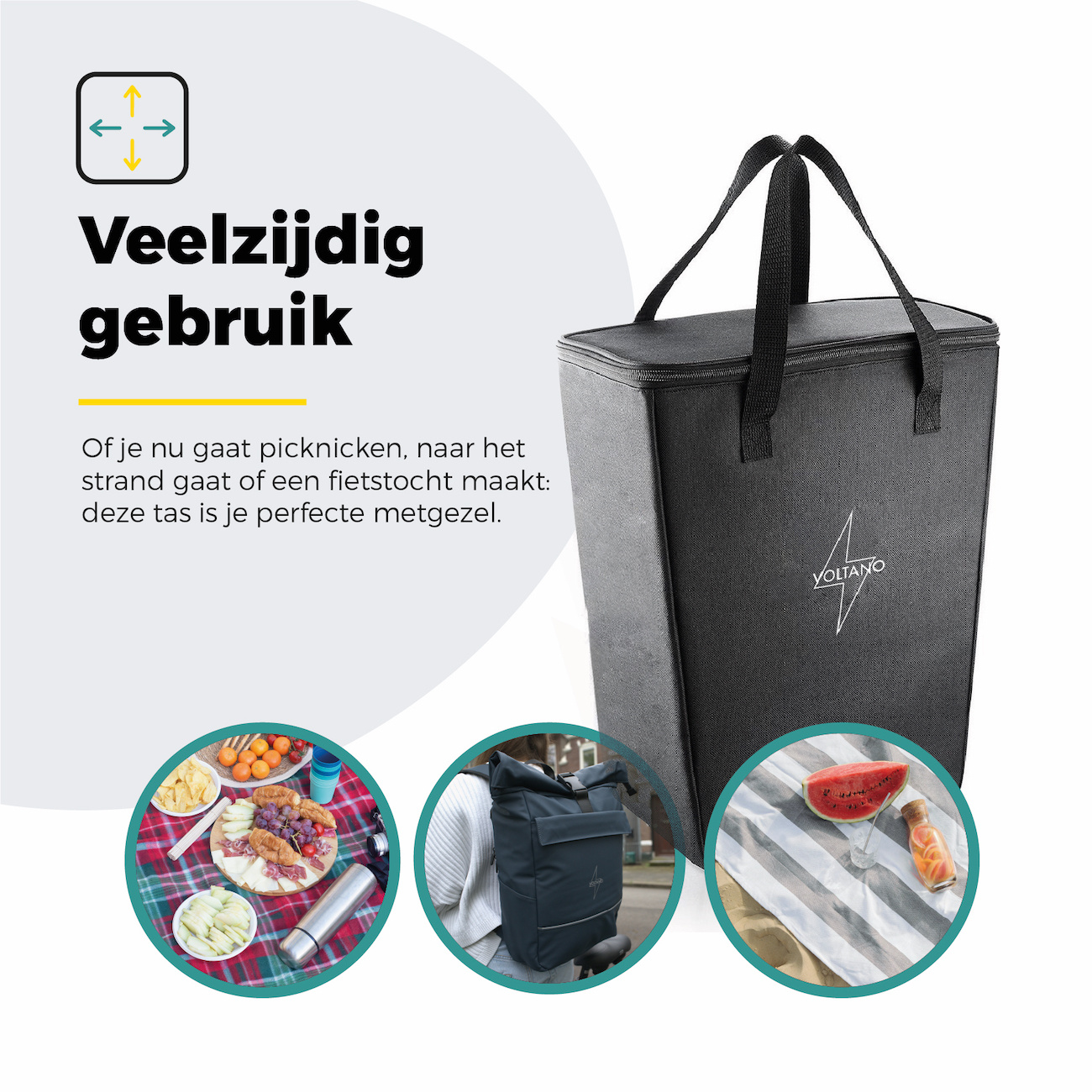 De Voltano koeltas is niet zomaar een accessoire – het is een slimme toevoeging aan je fietsroutine. Hij past moeiteloos in de meeste dubbele fietstassen, enkele fietstassen of rugzakken en is ook los te gebruiken. Door de stevige handvatten til je hem comfortabel mee naar de supermarkt of het park.