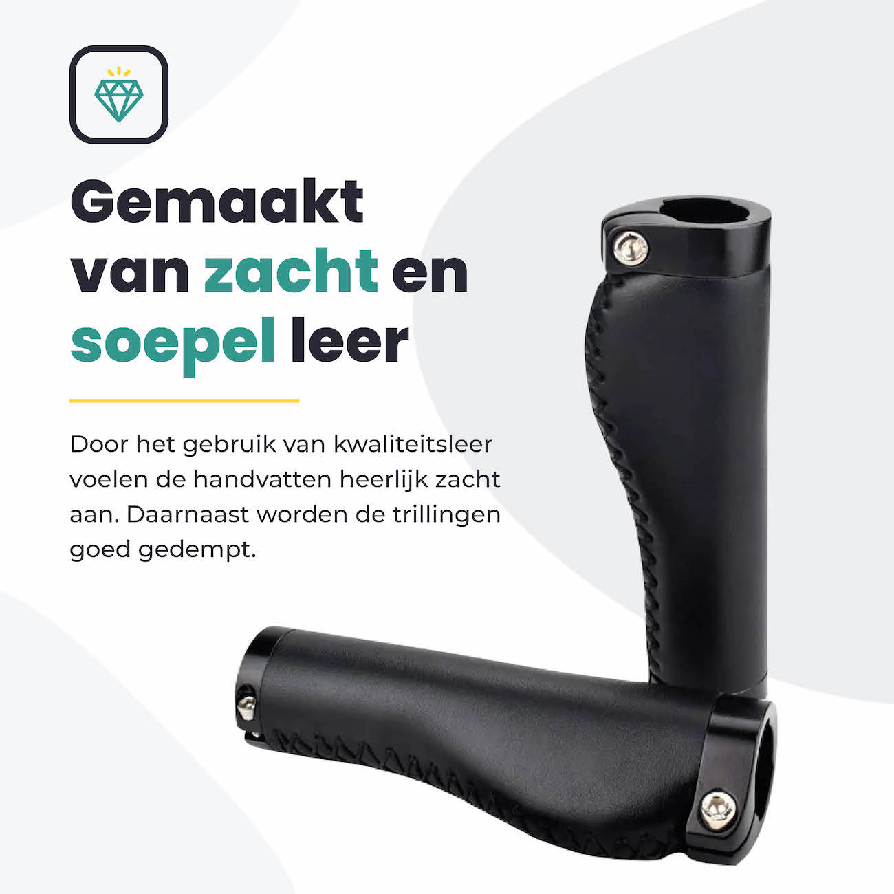 Deze handvatten zijn vervaardigd uit hoogwaardige materialen. Het oppervlak bestaat uit hand-gestikt leer. Dit oogt niet alleen luxe, het geeft ook een heerlijk comfortabele grip tijdens het fietsen. De ‘Lock-on” en inbus ringen zijn gemaakt van een aluminium legering. Met behulp van deze ringen kunnen de handvatten stevig op het stuur gemonteerd worden. Hierdoor schuiven en/of glijden ze niet uit positie tijdens het fietsen.