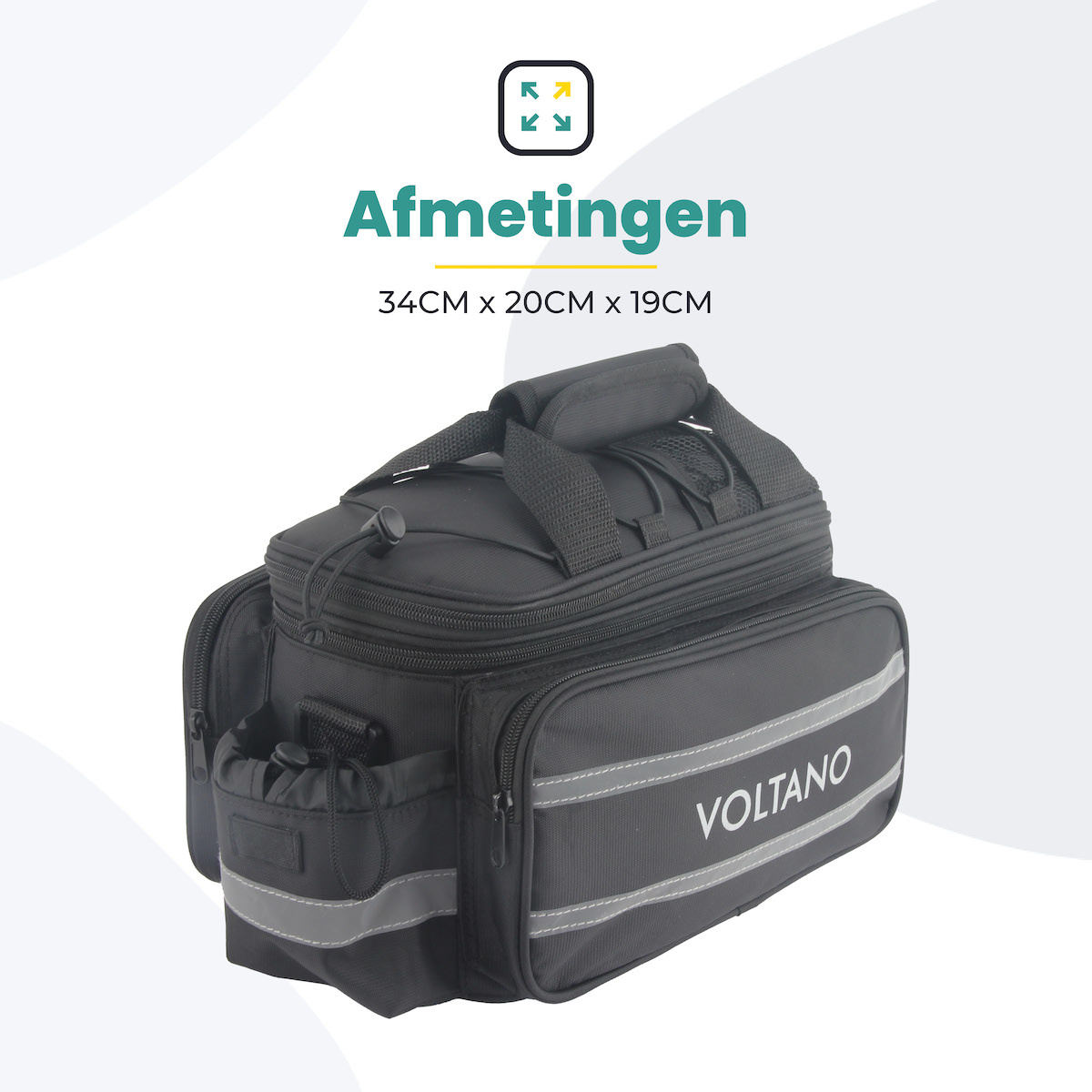 Het design van de Voltano bagagedrager tas is strak en modern, de zwarte kleur past bij vrijwel elke fiets. De tas is gemaakt van hoogwaardig polyester, wat zorgt voor een hoge duurzaamheid en bescherming tegen de elementen. Aan beide zijden van de tas zijn reflecterende elementen aangebracht, waardoor je ook in het donker goed zichtbaar bent. Dit draagt bij aan jouw veiligheid op de weg. De tas heeft een afmeting van 34 x 20 19 cm en een inhoud van maximaal 13 liter, hierdoor is er meer dan genoeg ruimte voor al je spullen.