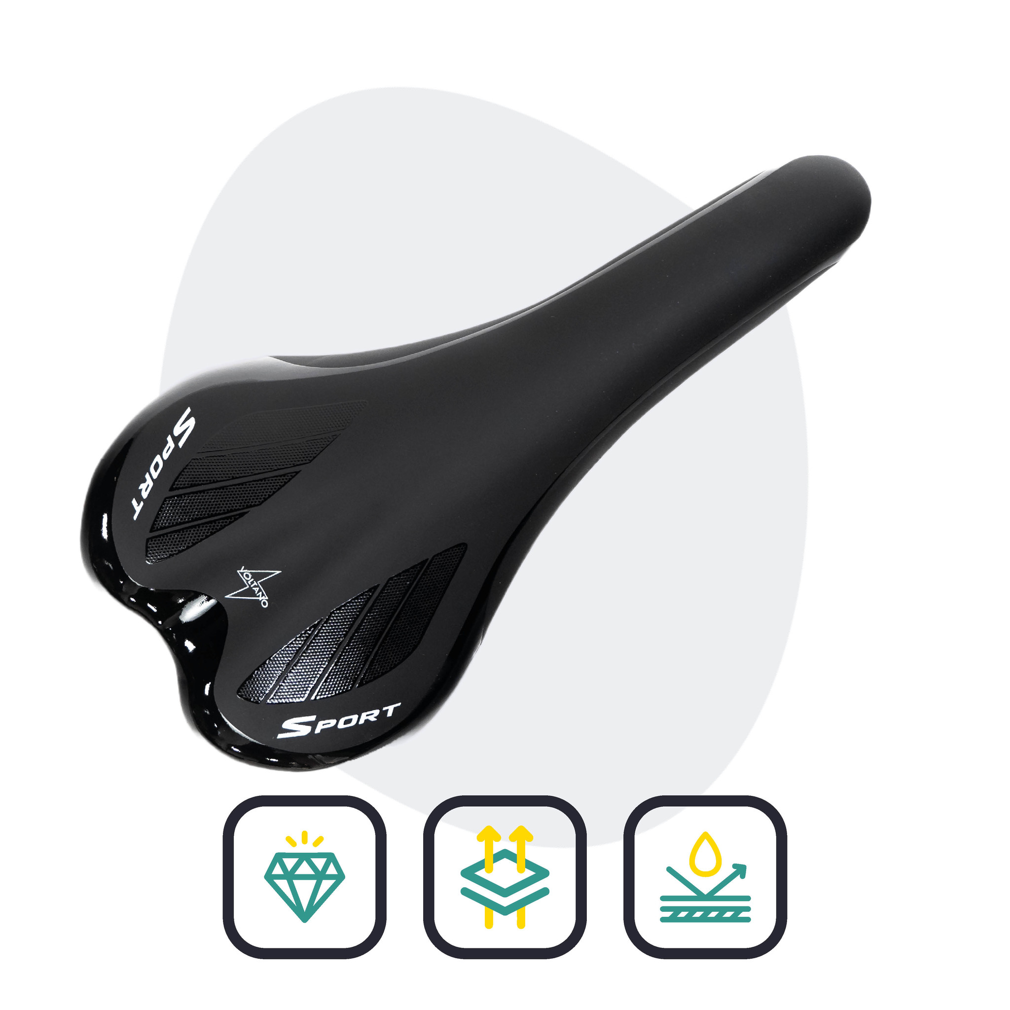 Het zadel wordt voornamelijk gebruikt bij Mountainbikes (MTB’s) of racefietsen. Ook beschikbaar in de kleuren: Zwart/Rood en Zwart/Zilver.