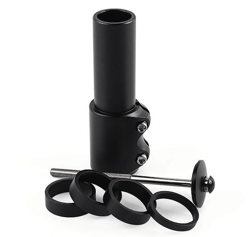 - Schuif vervolgens de verhoger over de vorkbuis (1 1/8” of anders met vulbus van 1” naar 1 1/8”) en zet deze vast.